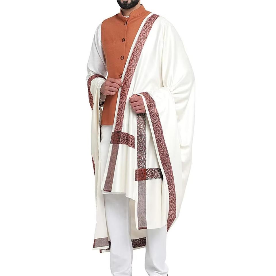 ผ้าคลุมไหล่ผ้าสีขาวสำหรับผู้ชายมุสลิมแบบดั้งเดิมพร้อมขอบผ้าทอสำหรับพิธีเฉลิมฉลองเทศกาลอิสลาม