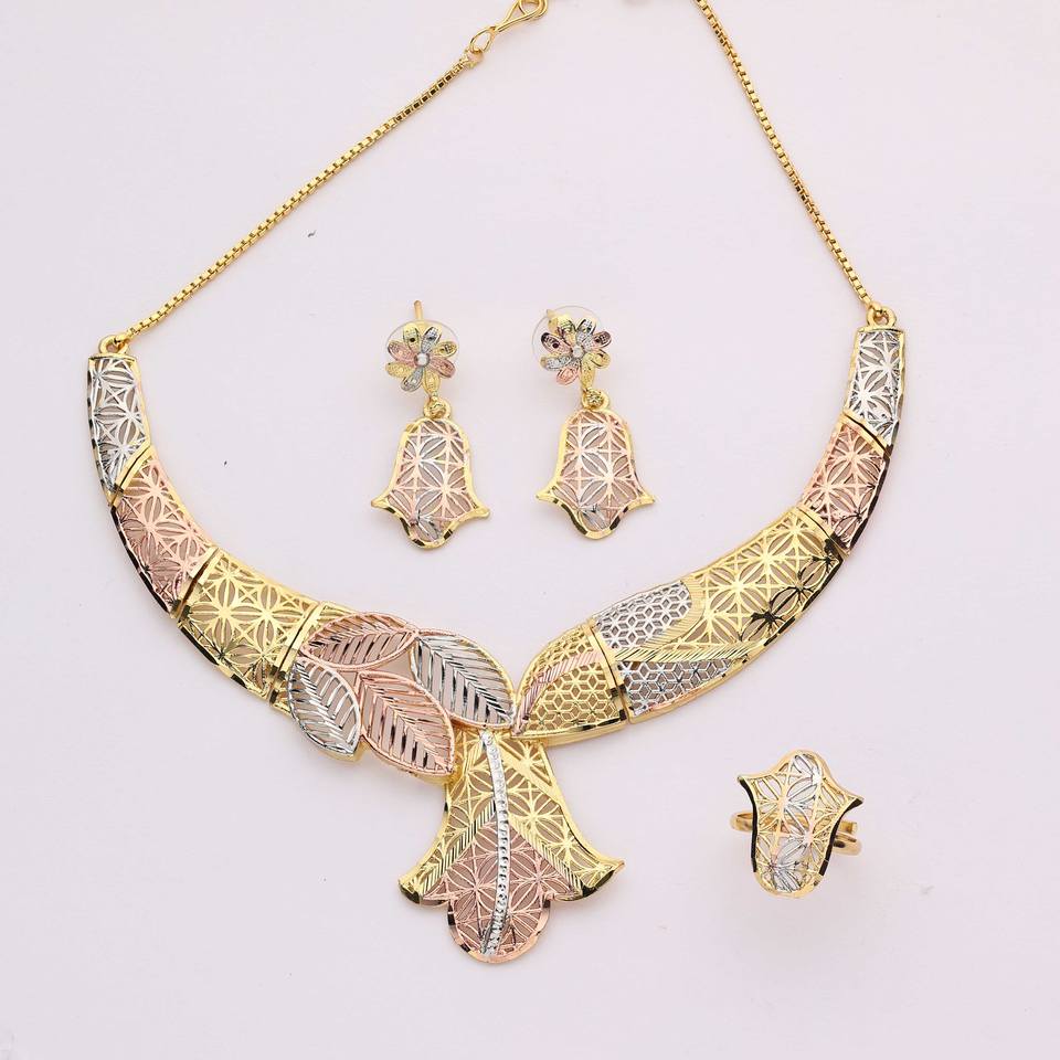 ชุดเครื่องประดับทองเหลืองชุบ 3 สีแบบดั้งเดิมสำหรับผู้หญิงออร์โธดอกซ์ สำหรับวันครบรอบ พร้อมสร้อยคอและต่างหู แบบกล่องสำหรับงานแต่งงาน