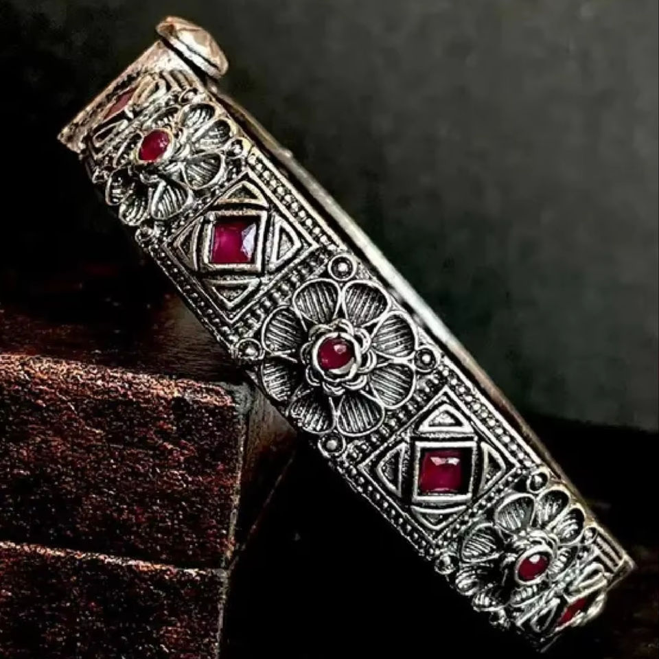 กำไลเงินโบราณแบบออกซิไดซ์ลายดอกไม้ประดับด้วยพลอยสีแดงทับทิม สไตล์วินเทจ เครื่องประดับแบบชาติพันธุ์สำหรับผู้หญิง