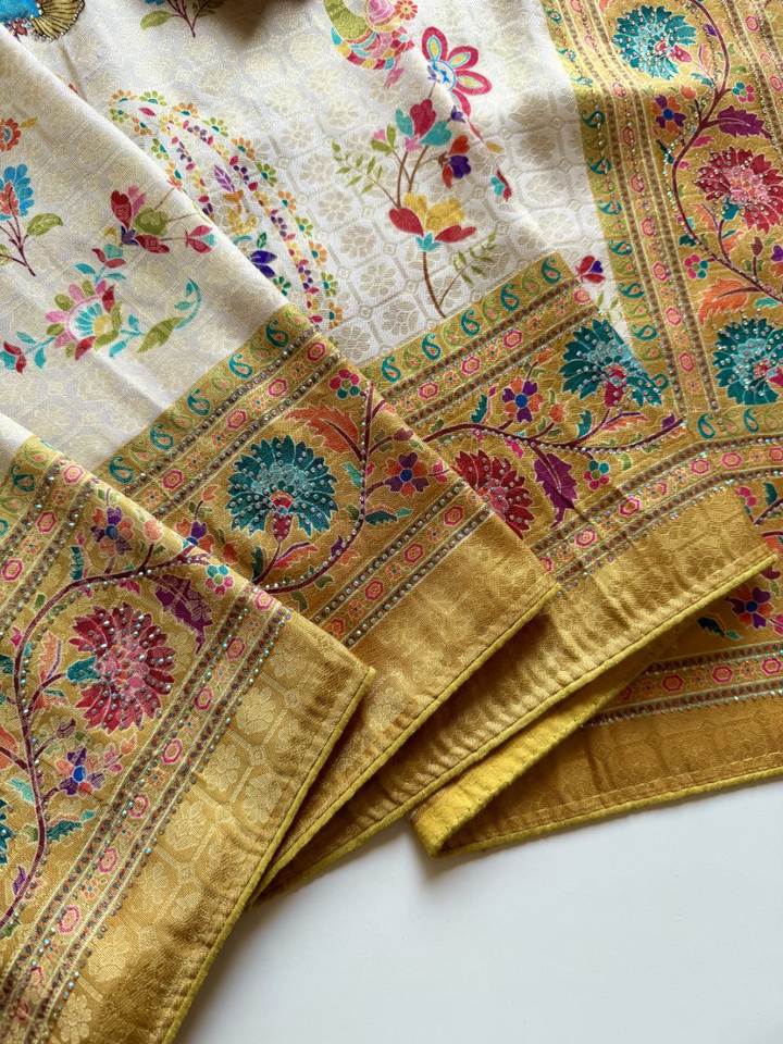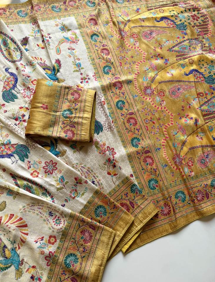 ผ้าไหมซาตินลายพิมพ์นกยูงแบบดั้งเดิม – ชุดสำหรับงานแต่งงานและงานเฉลิมฉลอง