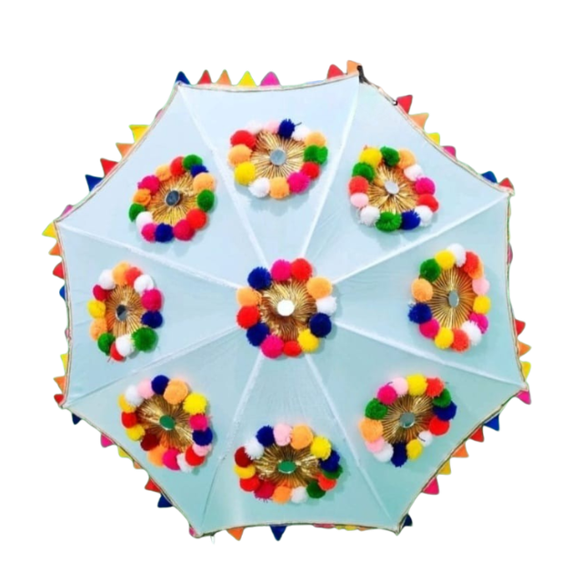 ร่มตกแต่งแบบดั้งเดิมของราชสถานพร้อมพู่หลากสี – อุปกรณ์ประกอบงานแต่งงาน