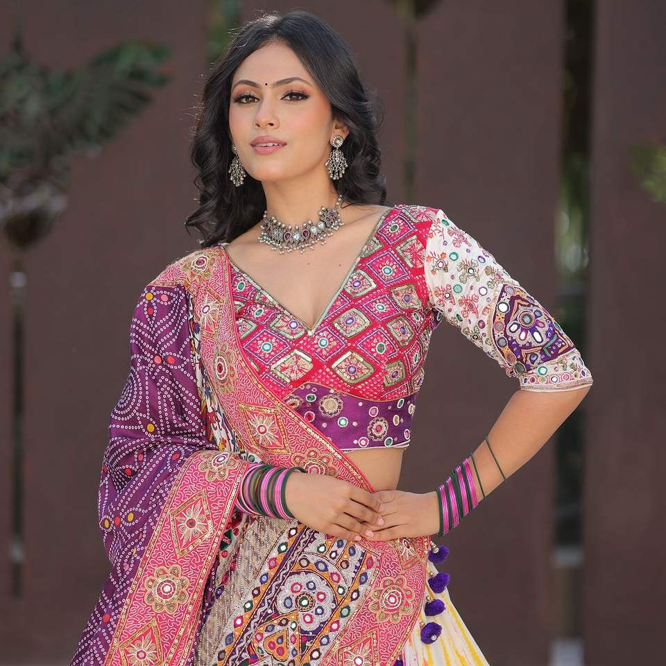 แบบดั้งเดิมของ rajasthani lehenga แบบทำด้วยมือ bandhani และ Kutch ทำงาน ghagra กับ dupatta สำหรับสวมใส่ตามเทศกาล