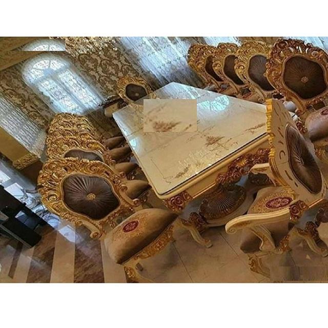 โต๊ะและเก้าอี้รับประทานอาหารพระราชวังแบบดั้งเดิม เฟอร์นิเจอร์รับประทานอาหารโปแลนด์สีทองหรูหรา เฟอร์นิเจอร์ห้องรับประทานอาหารแกะสลักหนัก