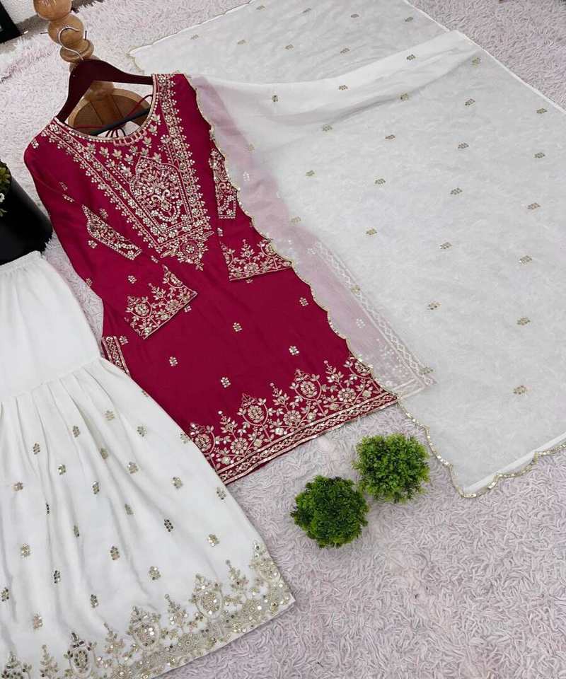 ชุด Sharara แบบดั้งเดิมที่มี dupatta และประดับประดาด้านบนสำหรับผู้หญิงที่เหมาะสำหรับโอกาสและการชุมนุม