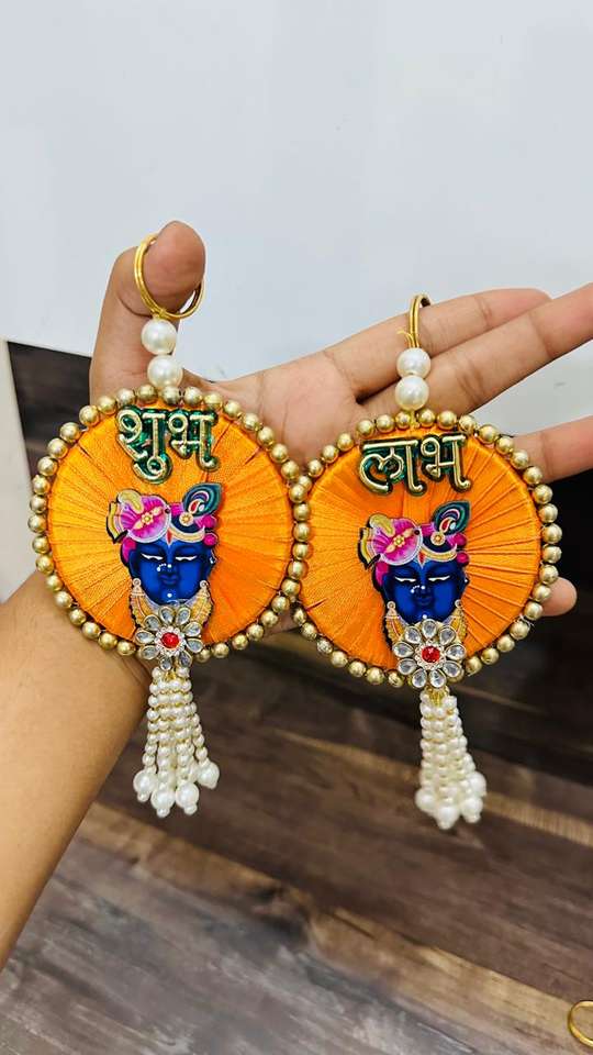 Shubh labh Puja แบบดั้งเดิมที่แขวนประตูทรงกลมพร้อมลูกปัด shubh labh สำหรับ Diwali พวงมาลัยงานแต่งงานและพวงมาลา