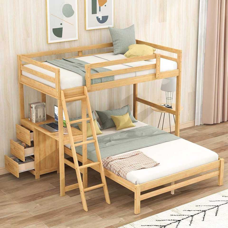เตียงสองชั้นไม้สนแท้แบบดั้งเดิม ขนาดเตียงคู่/เตียงเดี่ยว พร้อมลิ้นชักเก็บของ 3 ช่อง โต๊ะทำงานในตัว เตียงลอฟท์ ราวกั้น บันได แข็งแรงทนทาน สำหรับเด็กชายและเด็กหญิง
