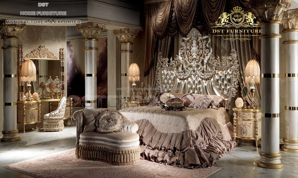 เตียงแกะสลักมือสีขาวและทอง & Nightstand สไตล์มือแกะสลักเฟอร์นิเจอร์ห้องนอนแฟนซีเจ้าหญิงขนาดเตียงพร้อมสตูลด้านข้าง