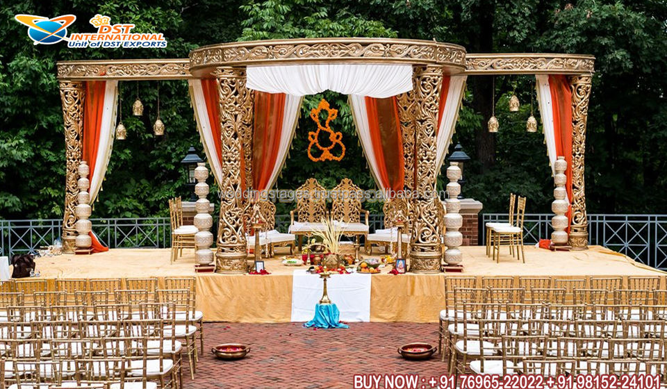 มณฑปงานแต่งงานแบบอินเดียแบบพกพาสไตล์ดั้งเดิม ทำจากไฟเบอร์เคลือบทอง ลายแกะสลักสีทอง พร้อมปรับแต่งขนาดและสีได้ตามต้องการ สำหรับส่งไปยังสหราชอาณาจักร
