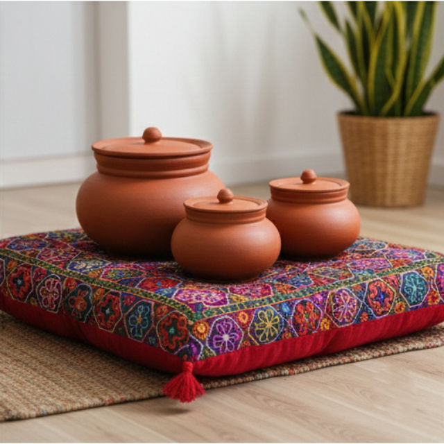 หม้อดินเผาแบบดั้งเดิมพร้อมฝาปิด (ชุด 3 ใบ) ทำด้วยมือ เป็นมิตรกับสิ่งแวดล้อม ทนทานต่อการซีดจาง SwamiG TradeX