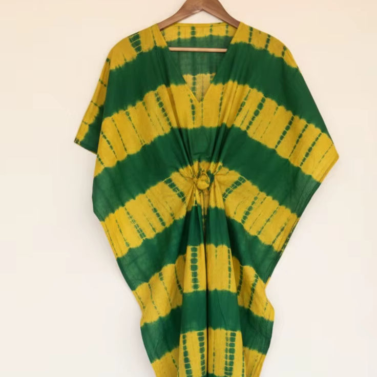 ชุดเดรสยาวแบบโบฮีเมียน คอวี ผ้าฝ้ายย้อมสีแบบดั้งเดิม ทำมือ เป็นมิตรกับสิ่งแวดล้อม ซักได้ ระบายอากาศดี ทรงหลวม เอวไม่รัดรูป สำหรับผู้หญิง