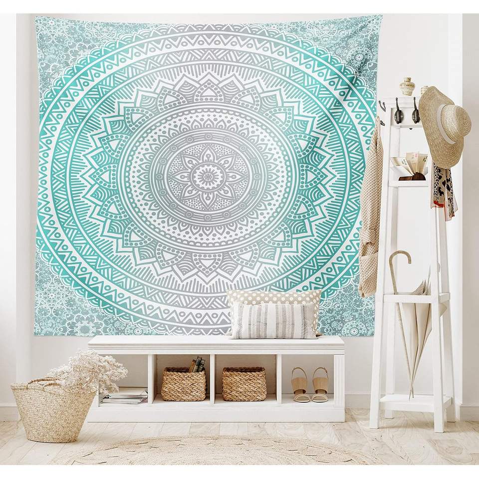 ผ้าแขวนผนังลายแมนดาลาแบบดั้งเดิม สีเทาอมฟ้า ลายชนเผ่าเรขาคณิต สำหรับตกแต่งบ้านในวันฮาโลวีน
