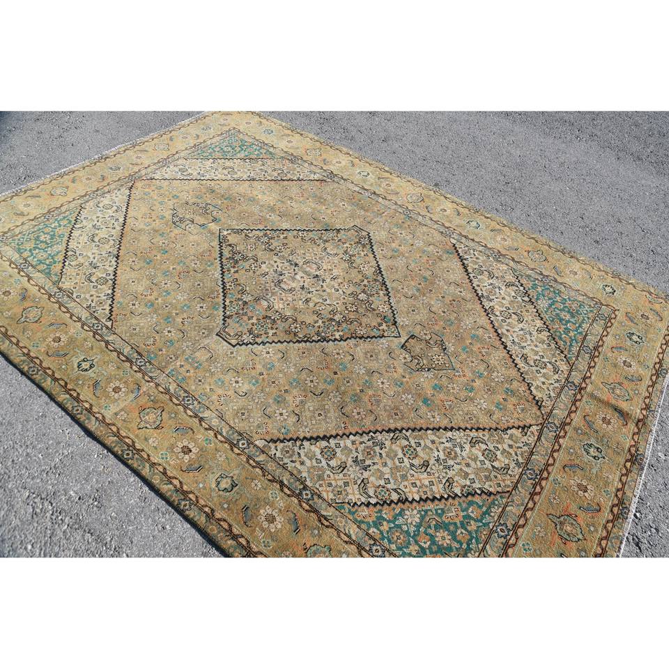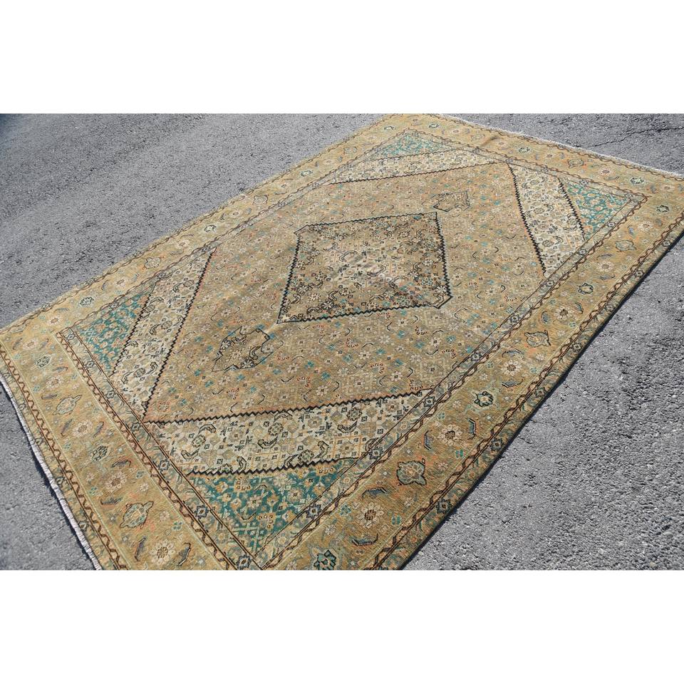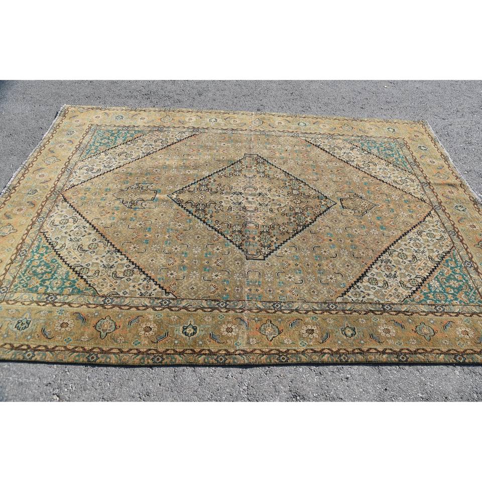 พรมปูพื้นลายเย็บปะสีเขียวเบจขนาด6.5ฟุต x 9.3ฟุตสไตล์ตุรกีโบราณแบบดั้งเดิมสำหรับห้องนั่งเล่น