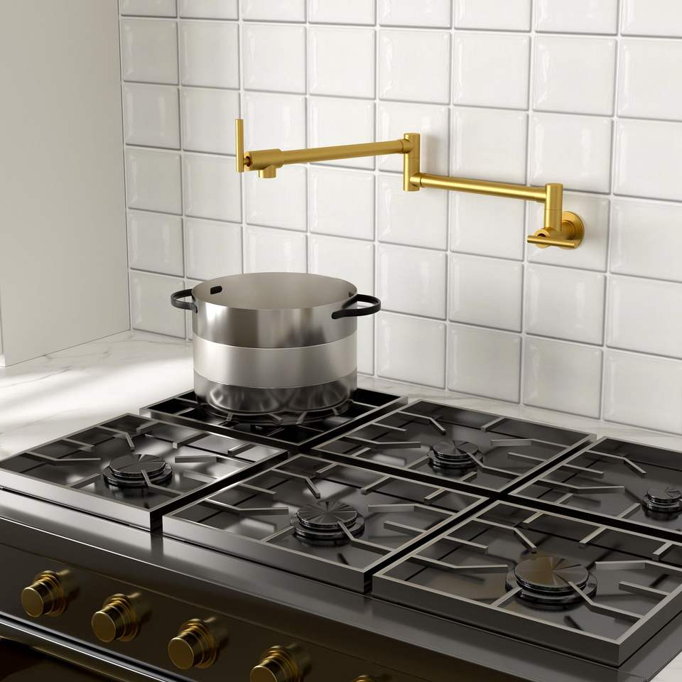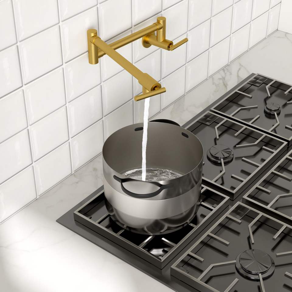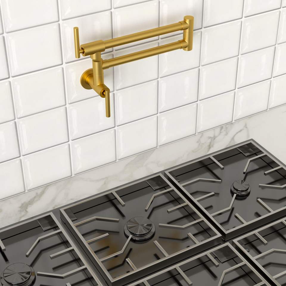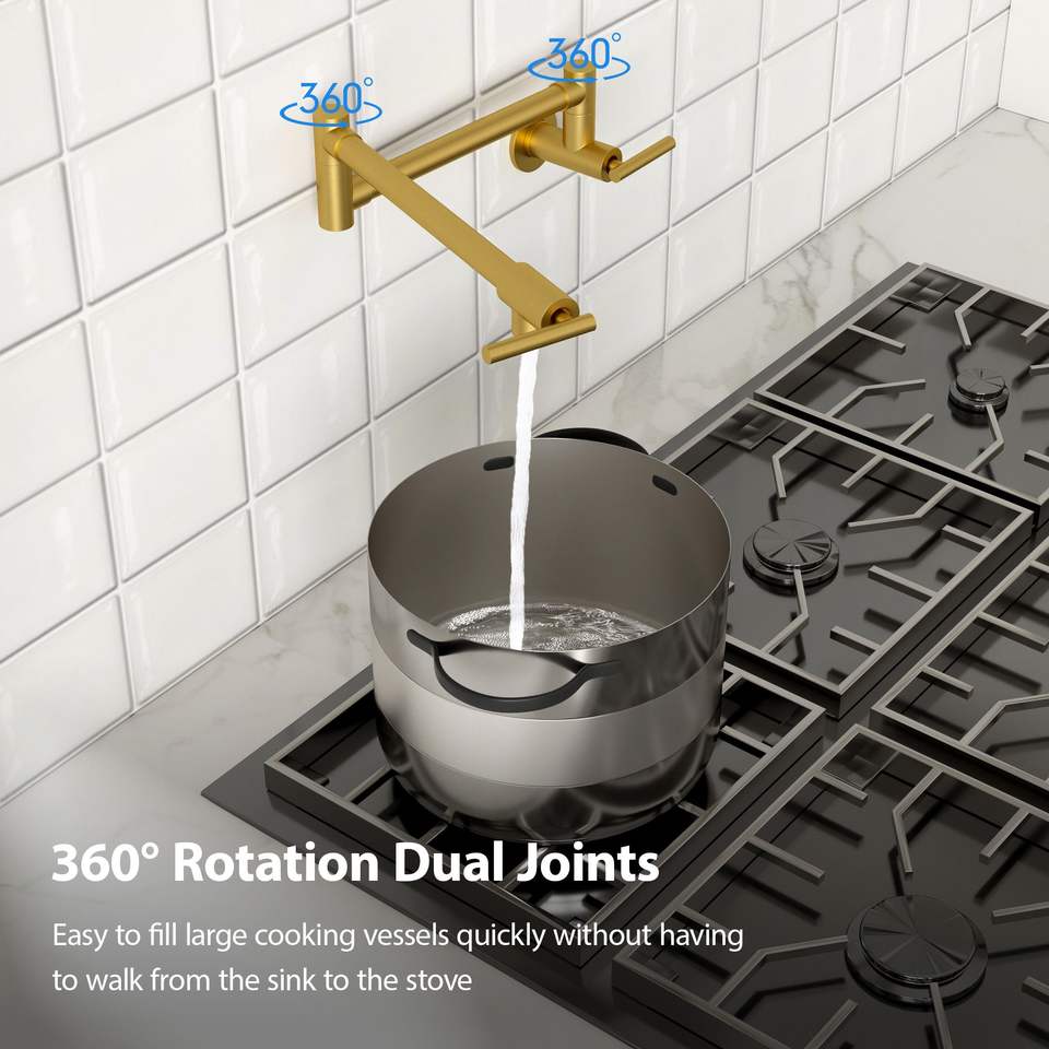 ก๊อกน้ำติดผนังแบบดั้งเดิมสำหรับห้องครัว พร้อมมือจับคู่ หมุนได้ 360 องศา แขนหมุนได้ และหัวเติมน้ำแบบพับได้สองทบ