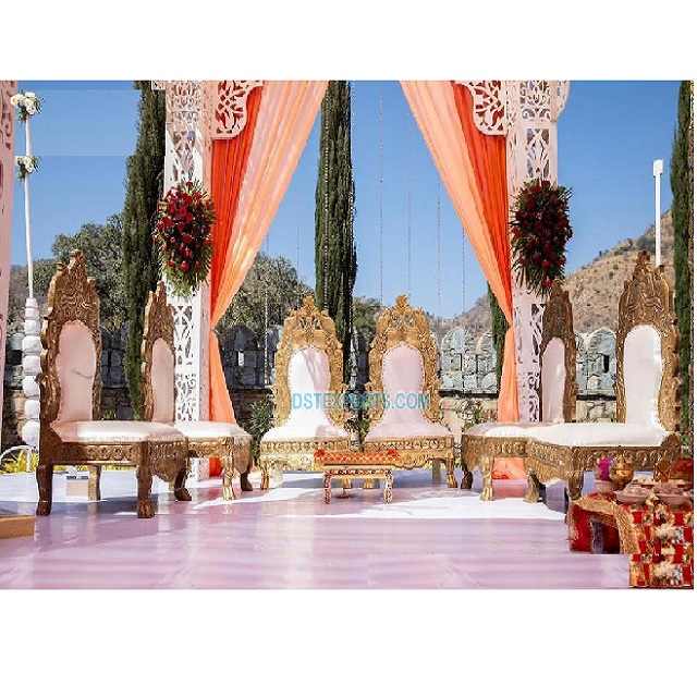 เก้าอี้แต่งงาน Vidhi แบบดั้งเดิมสำหรับ Mandap,เก้าอี้ Mandap แบบไม้แกะสลักสำหรับเจ้าสาวเจ้าบ่าวชุดเก้าอี้ Mandap ทำจากไม้แกะสลักสีทอง