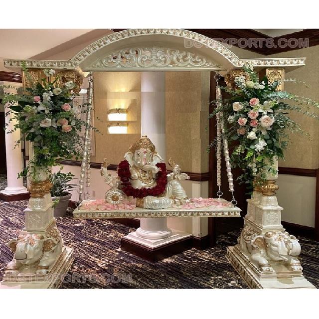 การตกแต่งชิงช้าไม้แบบดั้งเดิมด้วยพระพิฆเนศสีขาวมุกทางเข้างานแต่งงานไม้แกว่งเพชรที่สวยงามชุดชิงช้าแต่งงาน