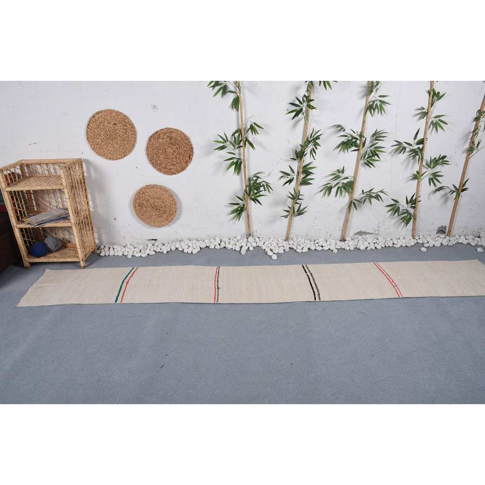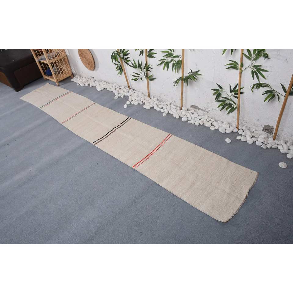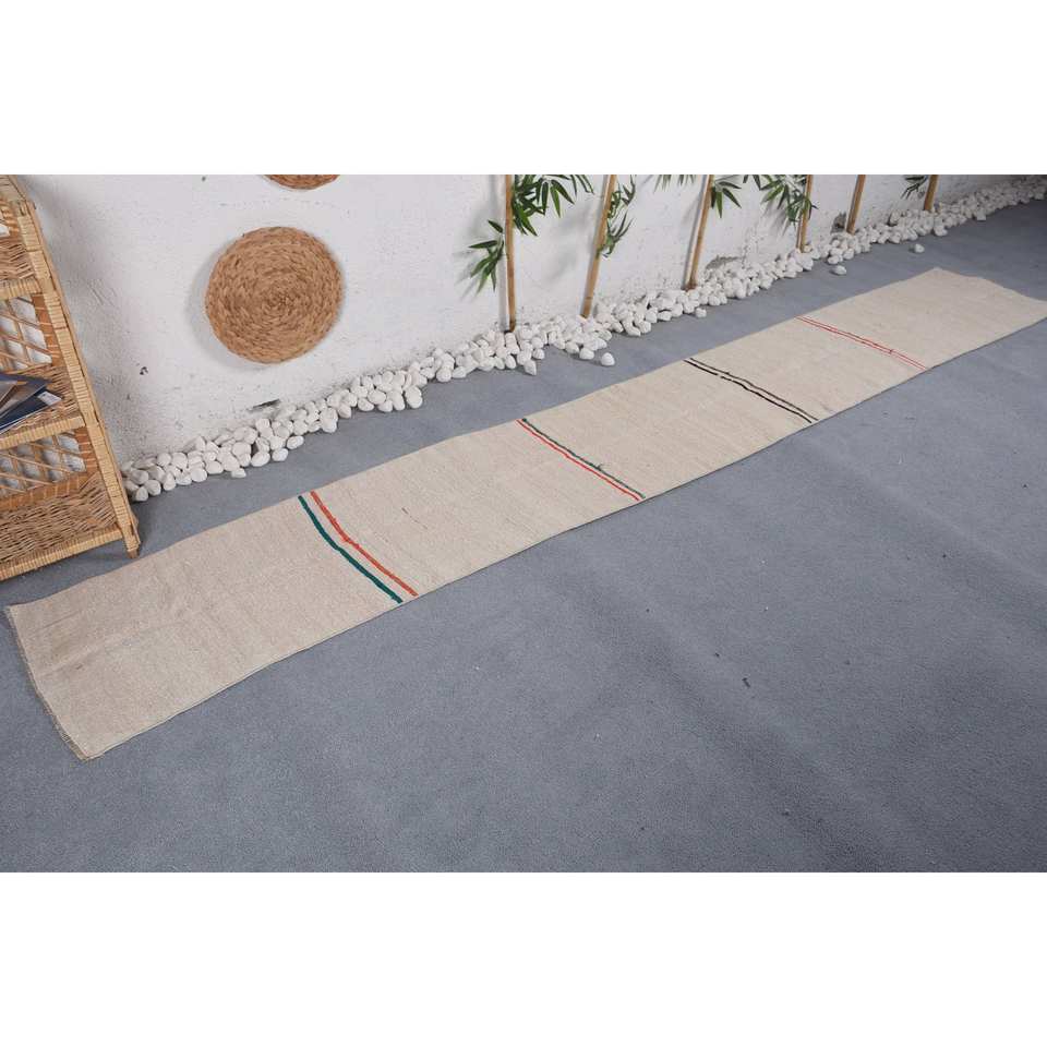 พรมขนสัตว์แบบดั้งเดิมลายทางสีเบจขนาด1.7x10.9ฟุตทำด้วยมือทำจากยางผ้ากำมะหยี่ด้านหลังห้องรับประทานอาหารรูปแบบการเย็บปะติดปะต่อกันแบบนามธรรมเป็นมิตรกับสิ่งแวดล้อม
