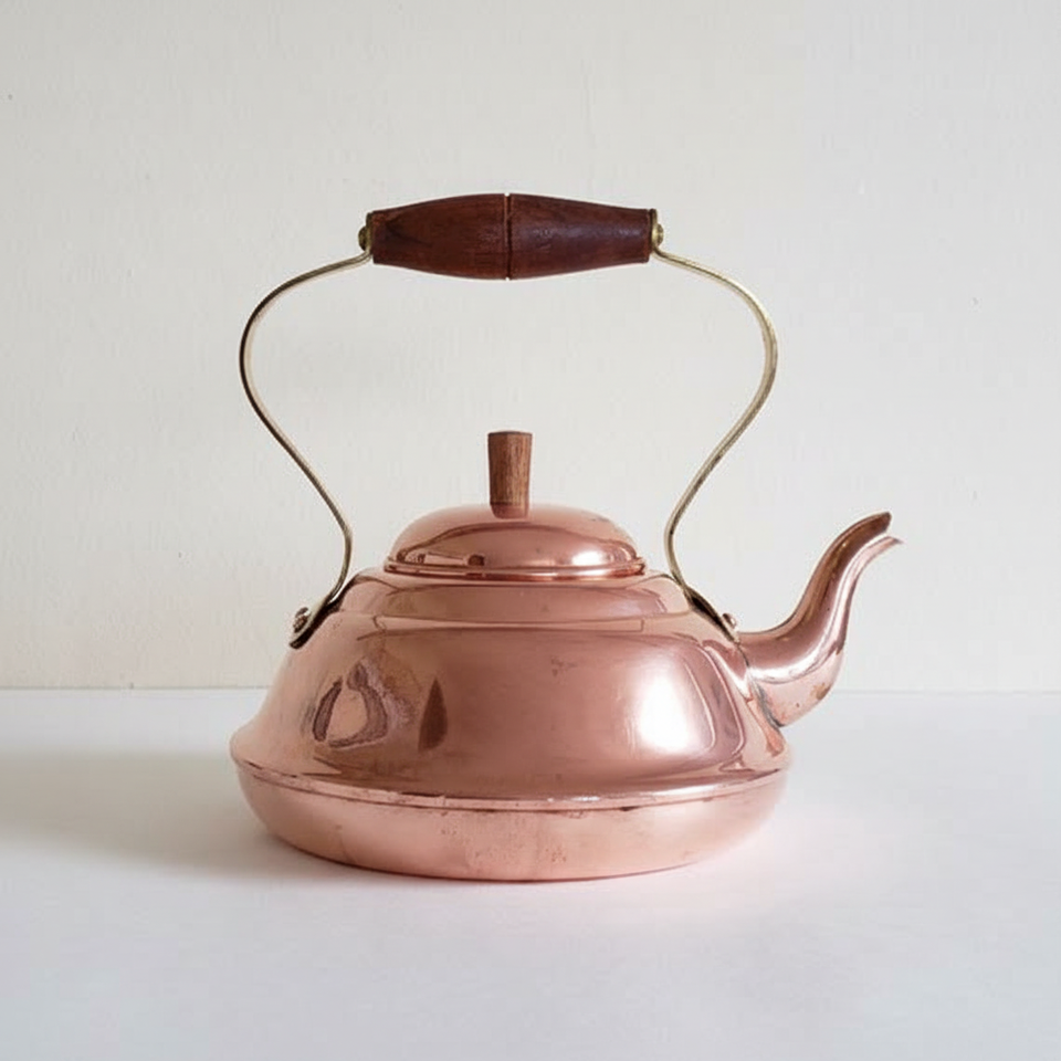 กาต้มน้ำทองแดงแบบดั้งเดิมที่มียอดโค้งมนและมีพวยที่แข็งแรงทำขึ้นสำหรับเตาและการตั้งค่าสภาพแวดล้อมแบบชนบท