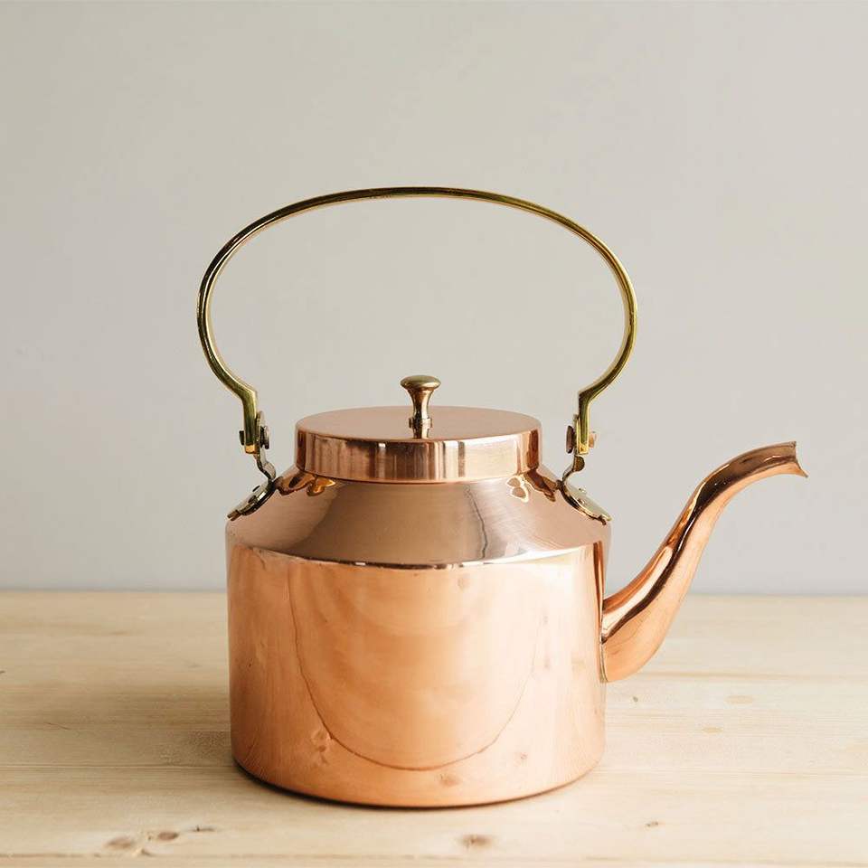 กาน้ำชาทองแดงตีลายแบบดั้งเดิมพร้อมด้ามจับไม้ ฐานแข็งแรง และเป็นของตกแต่งห้องครัวที่สวยงาม
