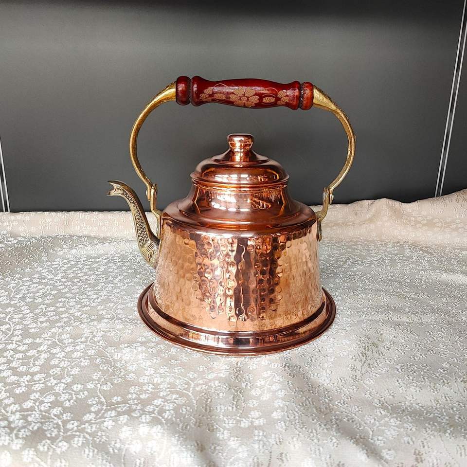 Traditional handmade copper tea kettle with elegant craftsmanship sturdy lid and comfortable heat safe handle