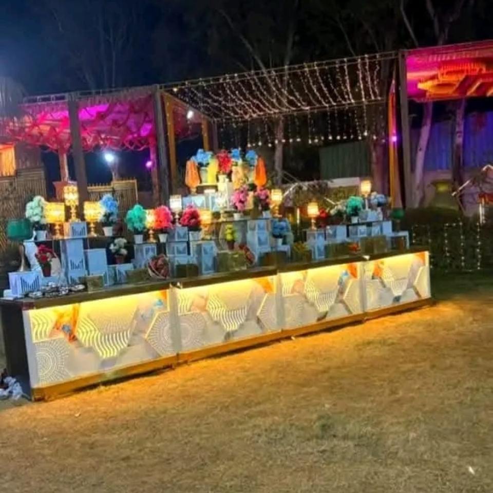 เคาน์เตอร์บุฟเฟ่ต์งานแต่งงานแบบดั้งเดิมพร้อมแผงอะคริลิคไฟ LED การตั้งค่าการจัดเลี้ยงแบบพับได้สำหรับกิจกรรมและงานเลี้ยงรับรอง
