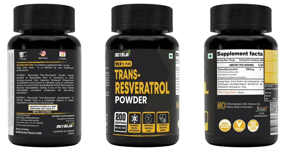 ผงทรานส์เรสเวอราโทรล - อาหารเสริมไมโครไนซ์บริสุทธิ์และมีจําหน่ายทางชีวภาพสูง 99.5% | ชะลอความชรา - (50 กรัม)