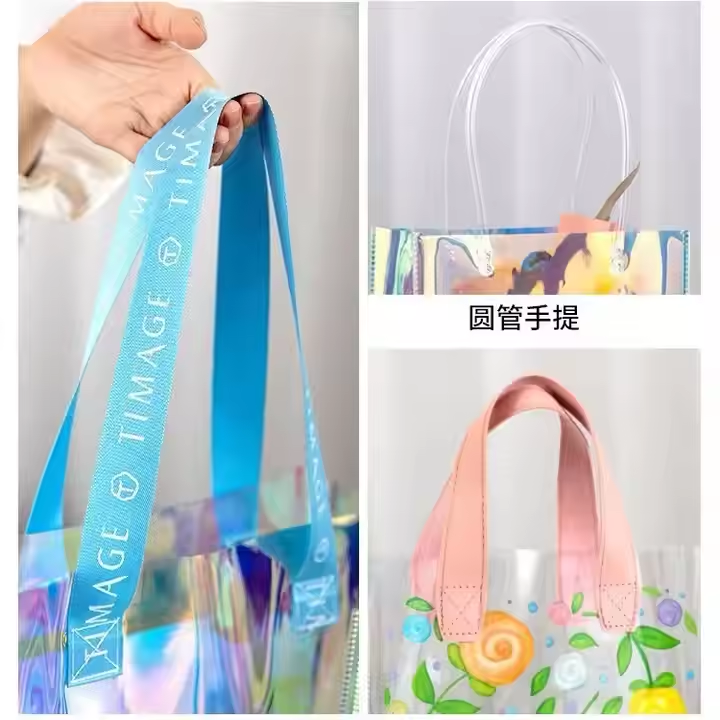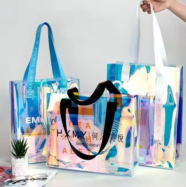 กระเป๋าโท้ท PVC โฮโลแกรมใสพร้อมโลโก้พิมพ์เลเซอร์สำหรับผ้าขนหนูชายหาดฤดูร้อน-ถุงของขวัญกลางแจ้ง