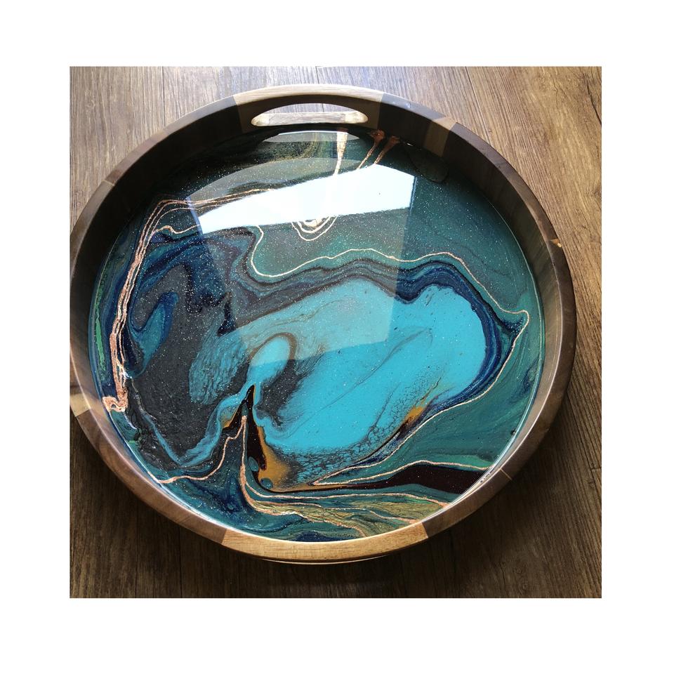 ถาดไม้และเรซินใสรูปทรงกลมสำหรับอาหารเย็นถาดเสิร์ฟอาหารทำจากไม้และเรซิน