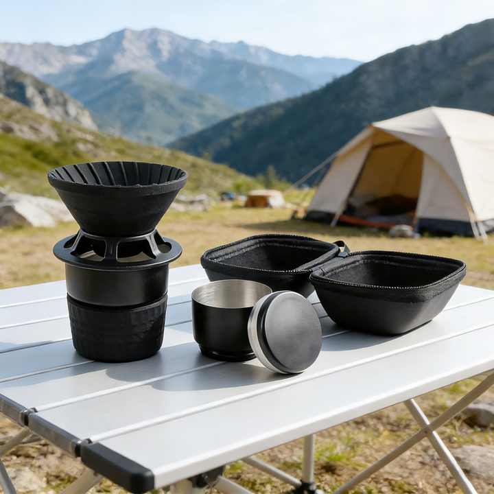 ชุดกาแฟสำหรับเดินทางสำหรับการตั้งแคมป์กลางแจ้ง สีดำด้าน ชุดเครื่องชงกาแฟแบบพกพาออลอินวัน