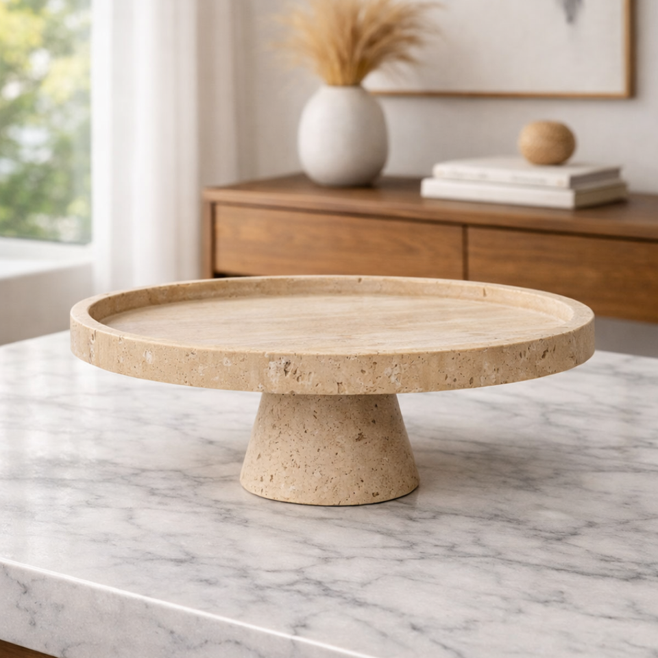 แท่นวางของทำจากหินอ่อนทราเวอร์ทีนสุดหรู ถาดโชว์เค้กหินธรรมชาติ ชามตกแต่งกลางโต๊ะทันสมัย งานแฮนด์เมด ขายส่ง