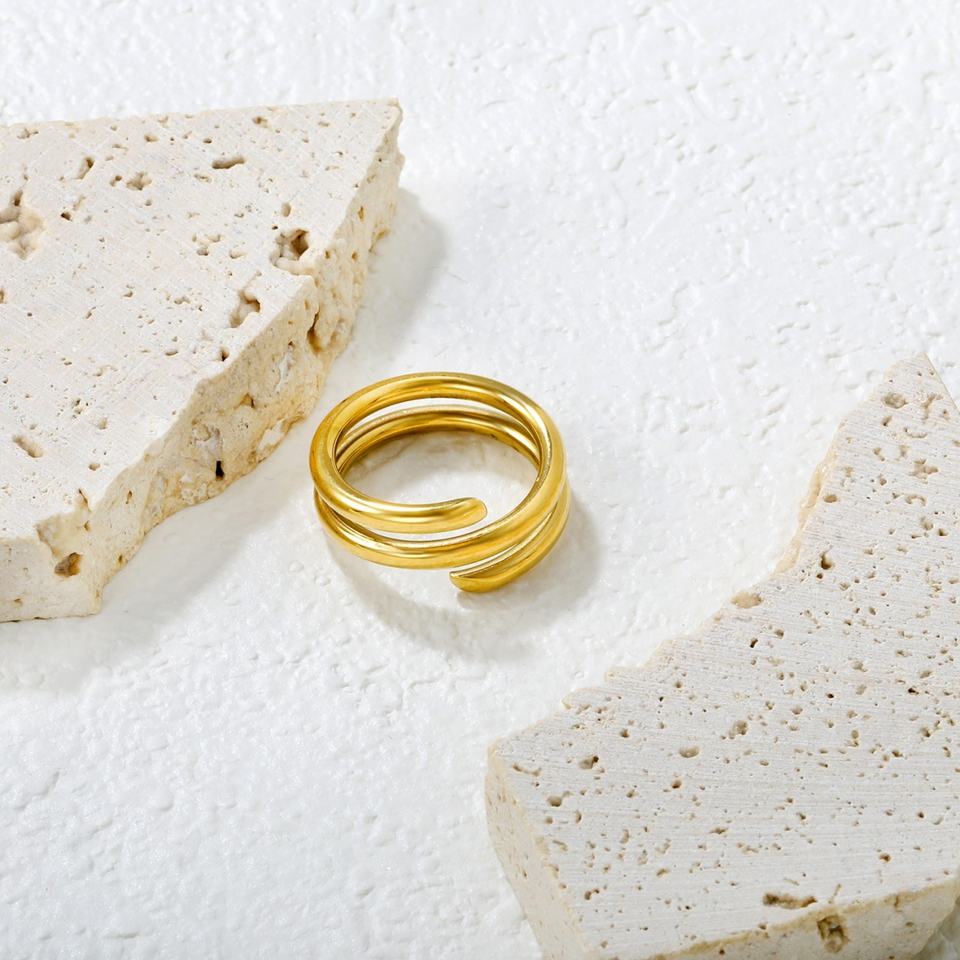 แหวนนิ้วสแตนเลสสตีลชุบทอง 18K ดีไซน์มินิมอลกันน้ำ ทรงกลวงปลายแหลมสามวงสำหรับผู้หญิง