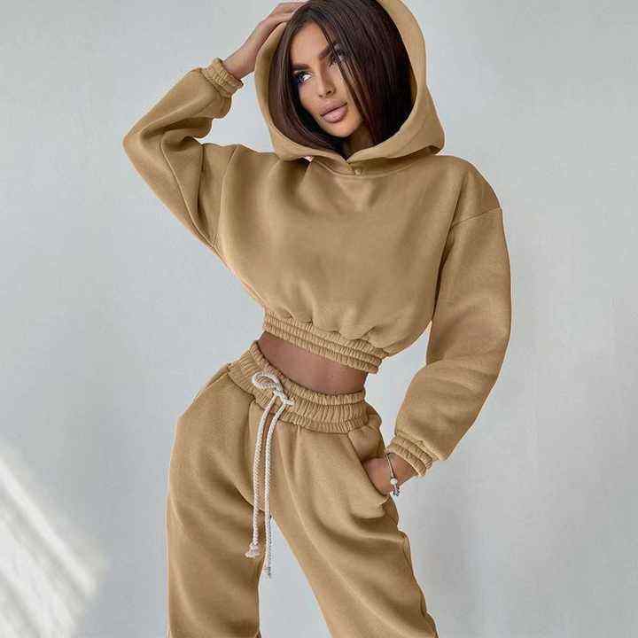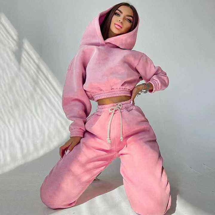 ชุดวอร์มผู้หญิงแฟชั่นฤดูหนาวแบบสั้น ผลิตจากโพลีเอสเตอร์ 100% เป็นมิตรต่อสิ่งแวดล้อม รับผลิตตามแบบ OEM พร้อมปักโลโก้ กางเกงวอร์มขายาวและเสื้อฮู้ดครอป