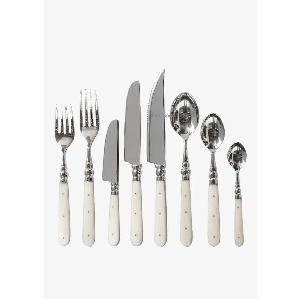 ชุดช้อนส้อมโลหะสีเงินแบบ2025ที่มีด้ามจับกระดูกสีขาวสำหรับโรงแรมและร้านอาหารชุดเครื่องใช้บนโต๊ะอาหาร