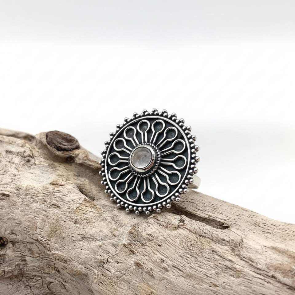 แหวนพลอยมูนสโตนเงินสเตอร์ลิง925เครื่องประดับแฮนด์เมดแหวนเงินสไตล์ Boho เป็นของขวัญสำหรับผู้หญิง