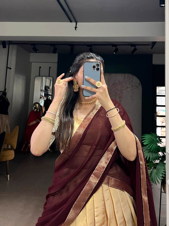 ชุดเลเฮนกาโชลีกันชิปุรัมแบบเย็บกึ่งสำเร็จรูปสวยงามทันสมัย พร้อมงานปักดิ้นทอง