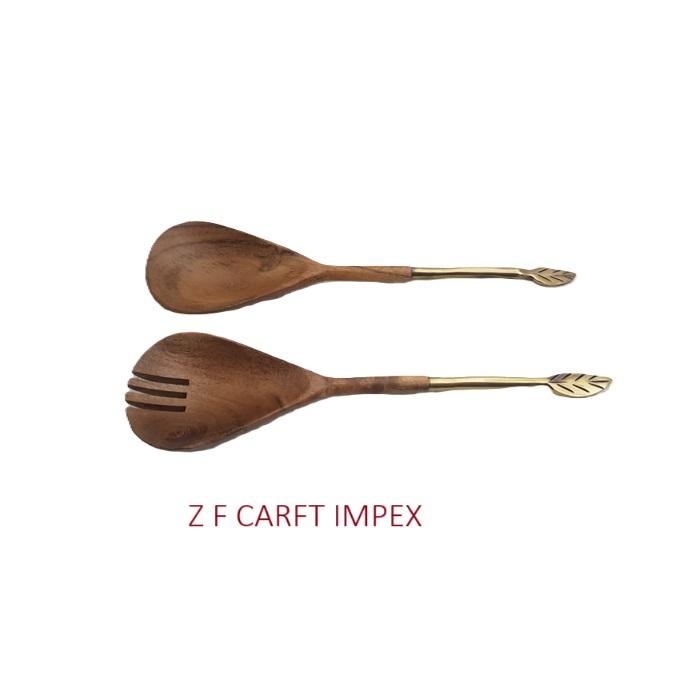 ชุดช้อนตักสลัดไม้อาเคเชียด้ามทองเหลืองมีด้ามจับที่เป็นเอกลักษณ์ช้อนเสิร์ฟสำหรับสลัดอุปกรณ์สำหรับเสิร์ฟสลัดในทางปฏิบัติ