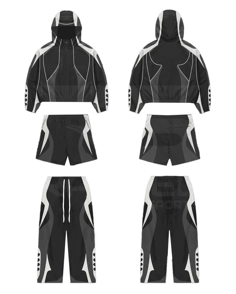 เสื้อแจ็กเก็ตและกางเกงขาสั้นมีฮู้ดและซิปสำหรับผู้ชายชุดวอร์ม100% ผ้าไนลอนกันลม