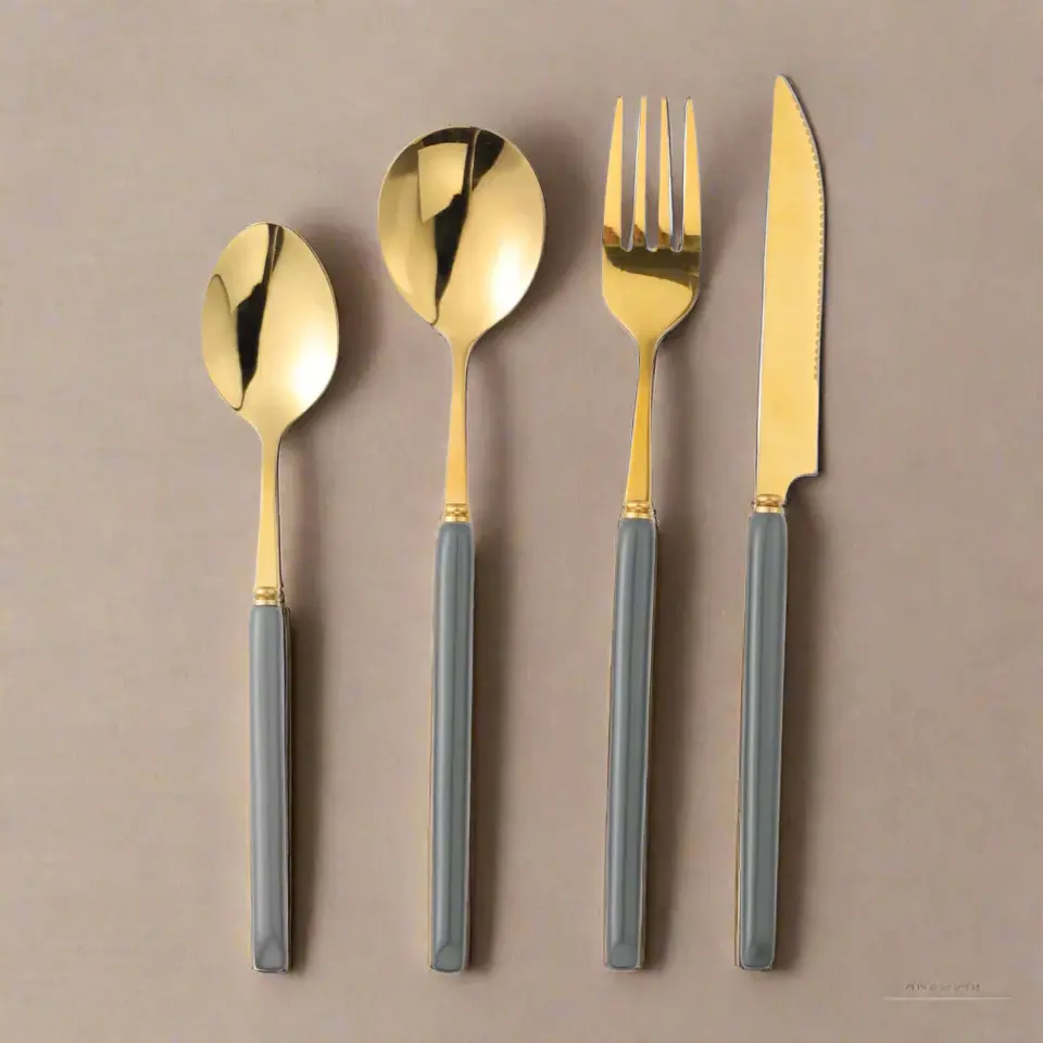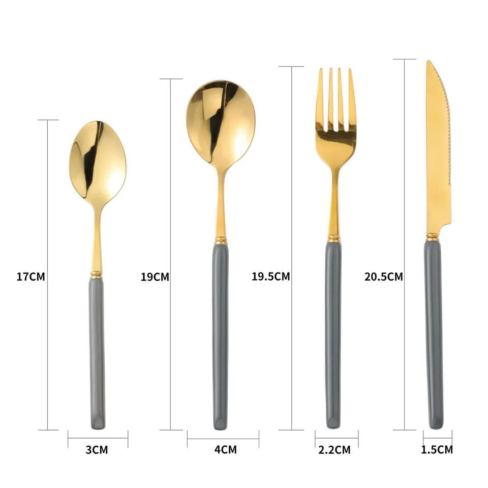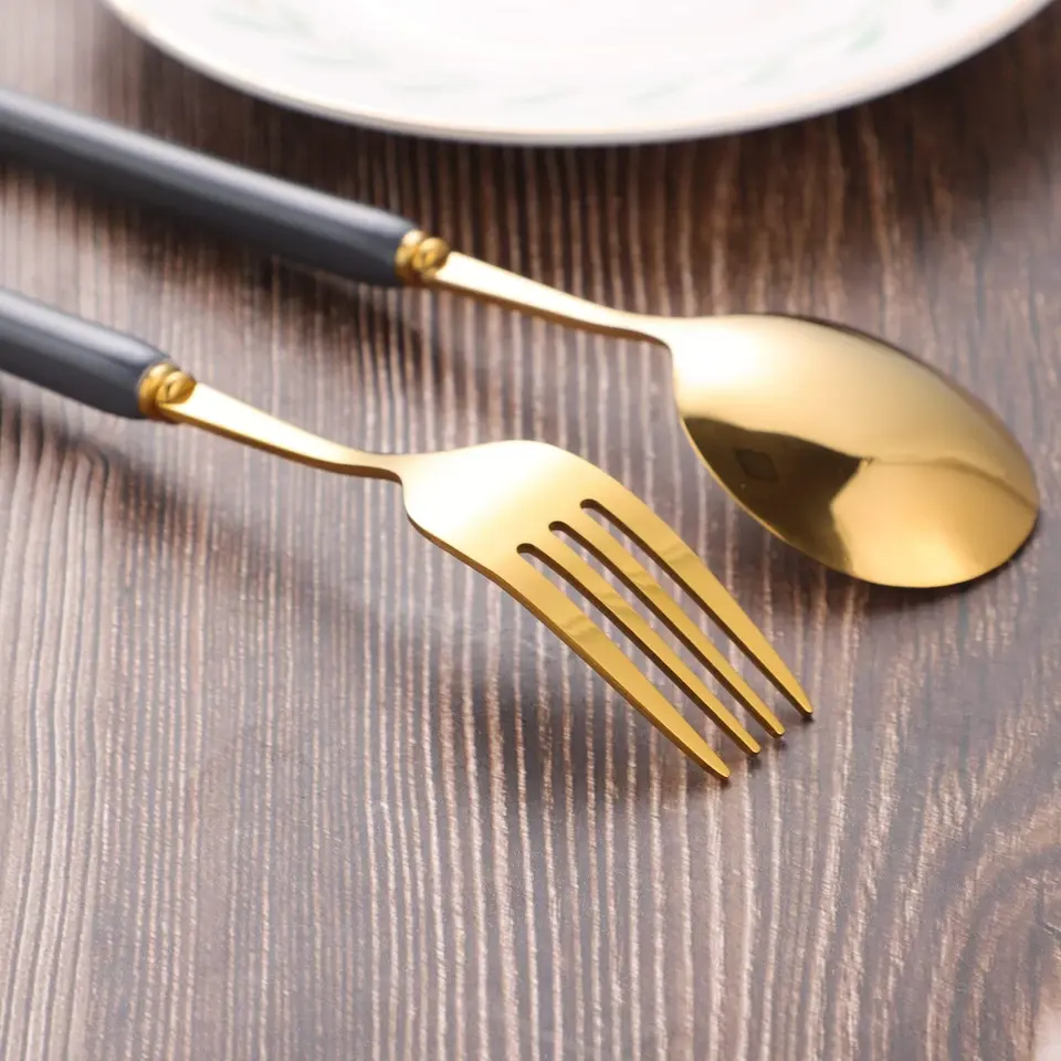 ชุดช้อนส้อมสแตนเลสคุณภาพสูงสำหรับงานปาร์ตี้ชุดช้อนส้อมบนโต๊ะทำจากโลหะดีไซน์แบบ PVD เคลือบทอง