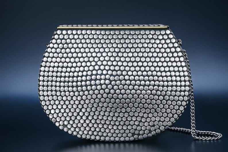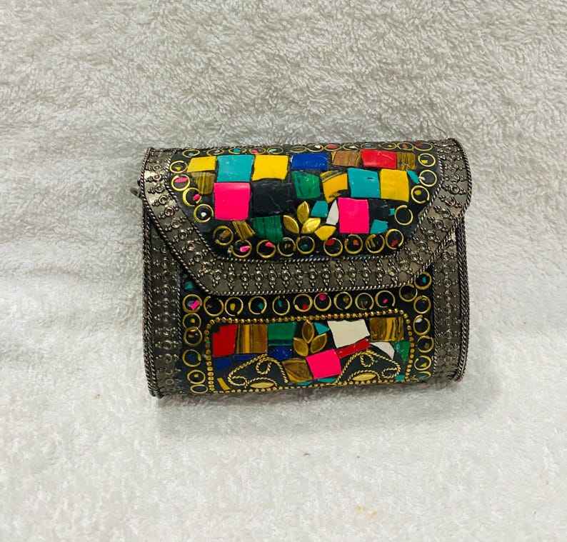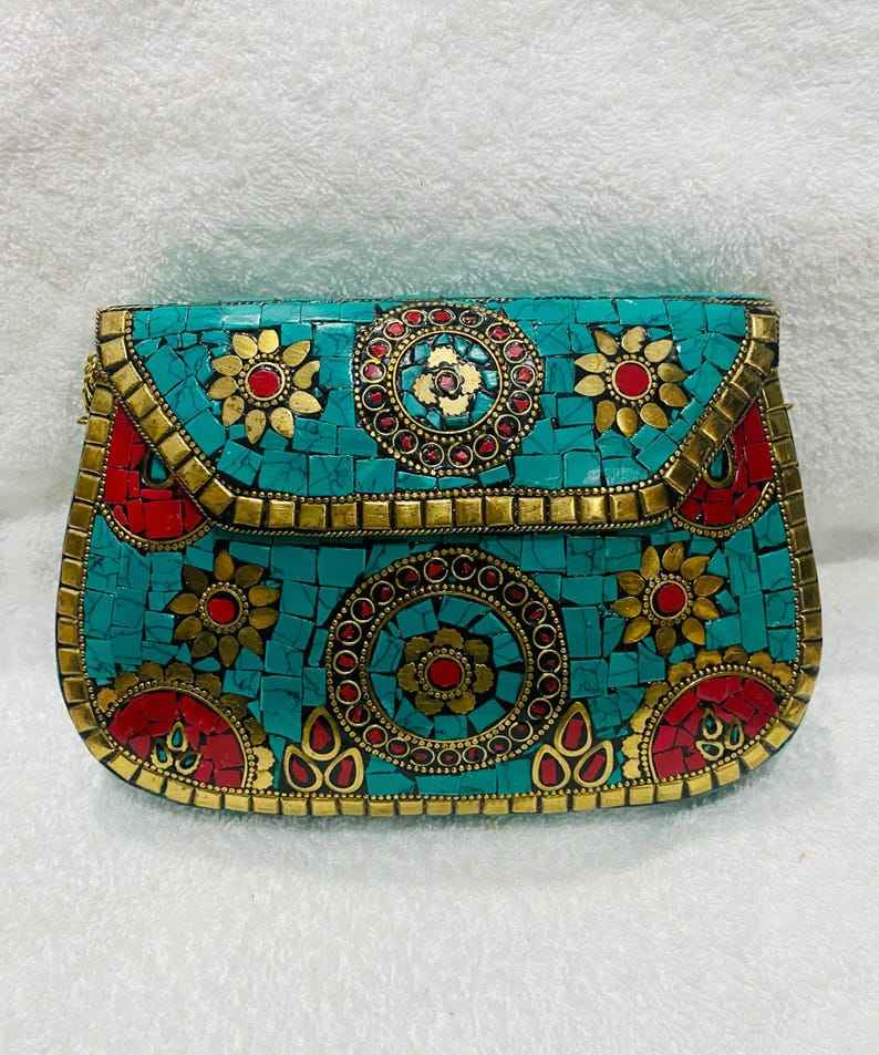 กระเป๋าคลัทช์โลหะดีไซน์ทันสมัยสำหรับสุภาพสตรี สีน้ำเงินประดับหินหลากสีสไตล์วินเทจลายโมเสก กระเป๋าถือแฟชั่น