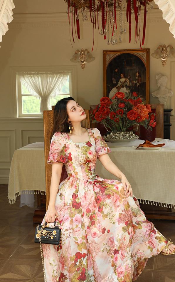 เดรสยาวพิมพ์ลายดอกกุหลาบสีแดงวินเทจพร้อมคอสี่เหลี่ยมเดรส Maxi ทรงหลวมน้ำหนักเบามีไซส์ใหญ่