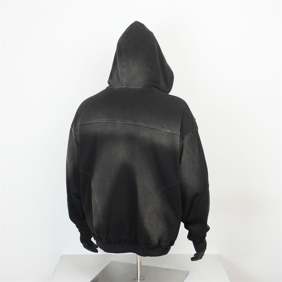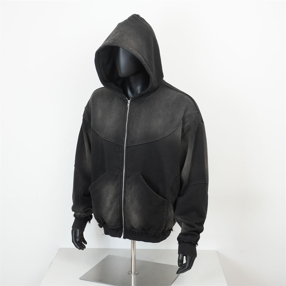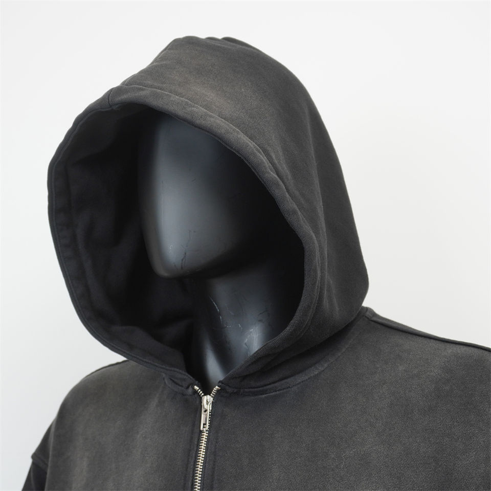 เสื้อฮู้ดดี้สีดำซีดสไตล์วินเทจ ผ้าฝ้ายเฟรนช์เทอร์รี่ ทรงโอเวอร์ไซส์ ล้างสีแบบแอซิดวอช ซิปหน้า สำหรับผู้ชาย กำลังเป็นที่นิยม