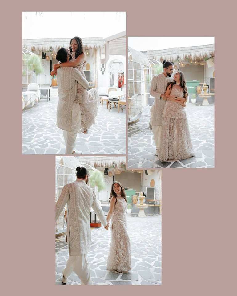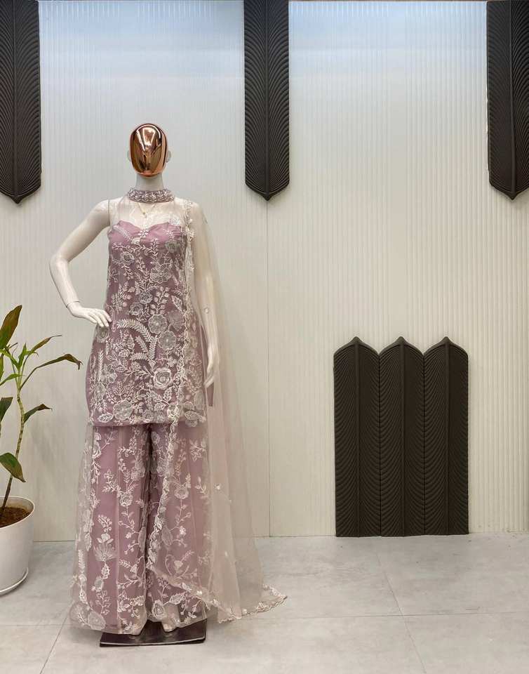 ชุดคุร์ตะแบบดั้งเดิมคอ halter พร้อมกางเกง palazzo และผ้าคลุมไหล่ ผ้าลายผีเสื้อ ปักเลื่อมลายกระจก เหมาะสำหรับงานเทศกาลและงานปาร์ตี้สไตล์อินเดีย