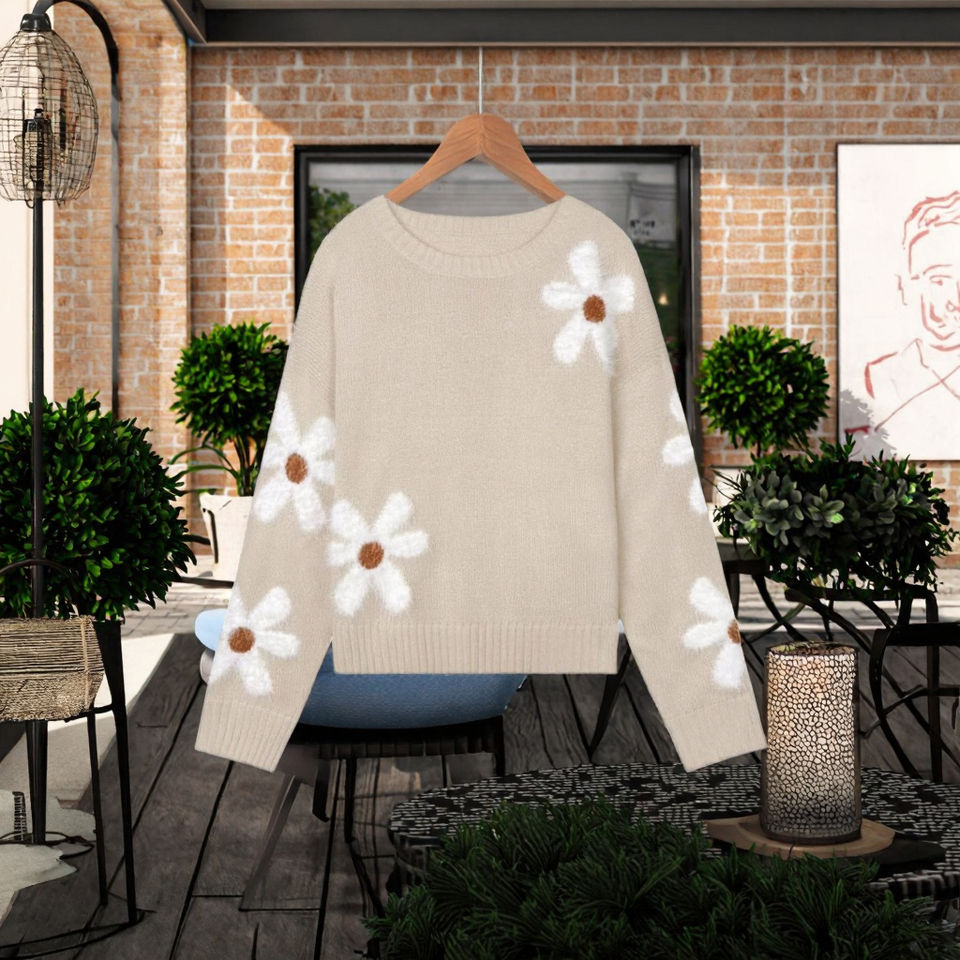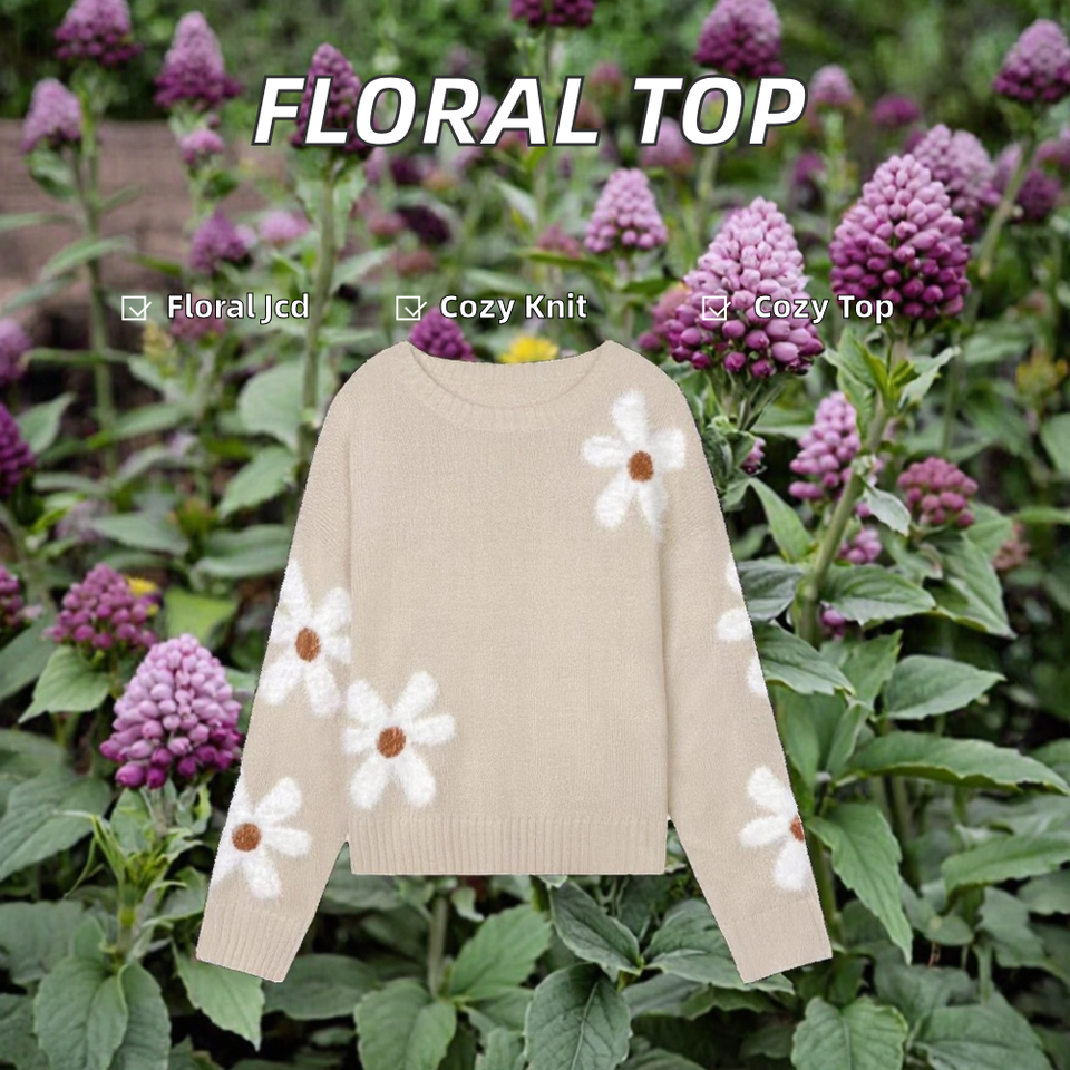 เสื้อสเวตเตอร์แบบสวมหัวคอกลมแขนยาวสำหรับผู้หญิงเสื้อถักแจ็คการ์ดลายดอกไม้สำหรับฤดูหนาวมีดีไซน์ด้านหน้า