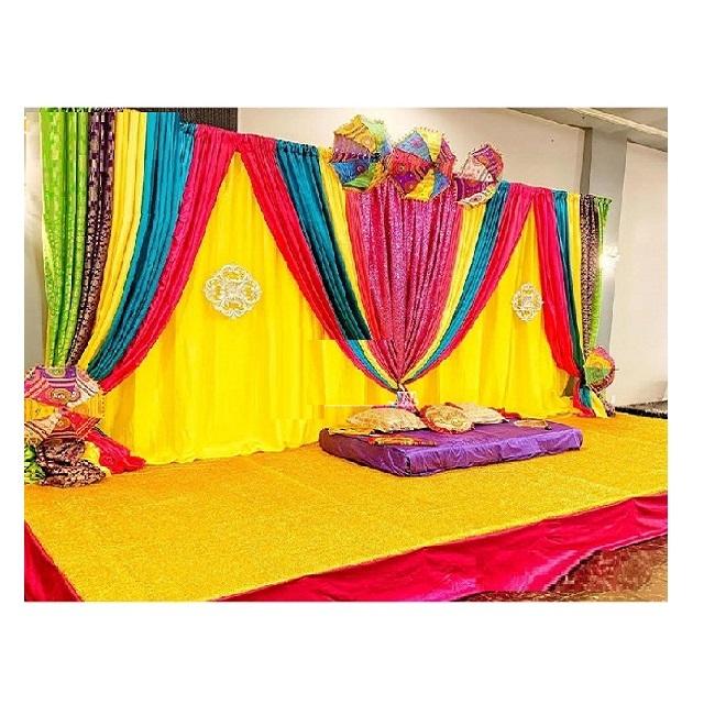 ผ้าม่านฉากหลังลายฮัลดีเนื้อผ้าไอซ์ซิลค์น้ำหนักเบา กำลังเป็นที่นิยมสำหรับตกแต่งพิธีแต่งงานแบบอินเดีย พร้อมขนาดที่ปรับแต่งได้