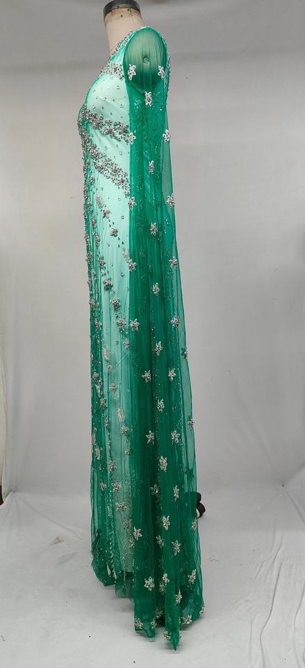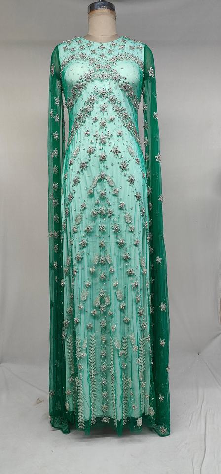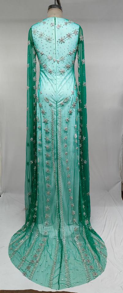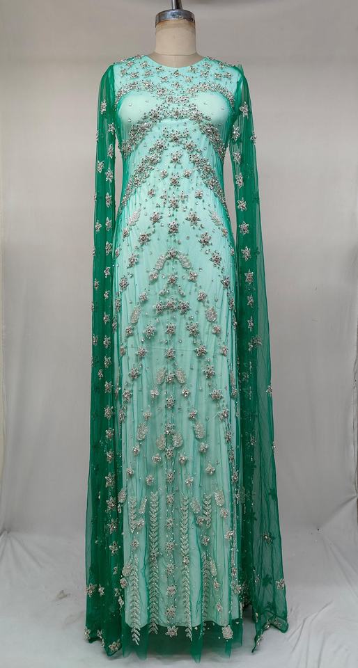 ชุดราตรีหรูหราสีเขียวมิ้นท์ประดับเลื่อมและลูกปัด งานออกแบบสุดหรู แขนซีทรู แฟชั่นชั้นสูง