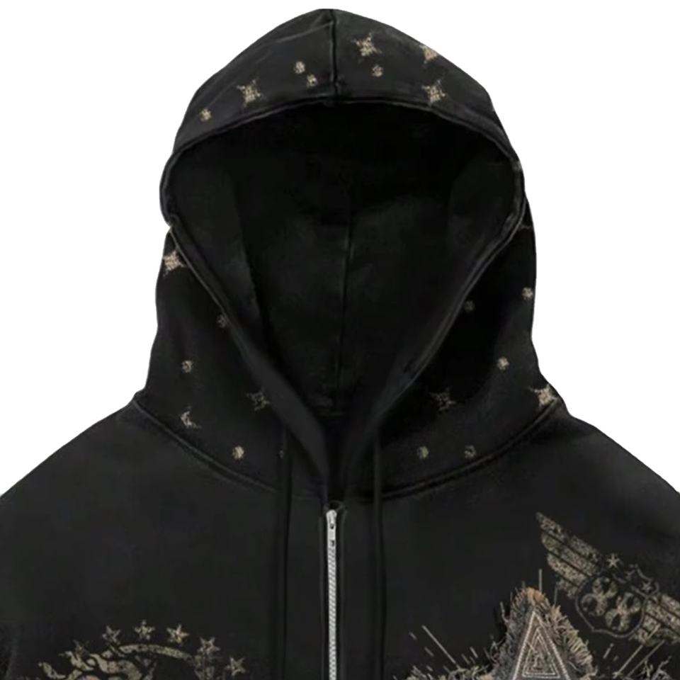 เสื้อฮู้ดดี้แขนยาวทรงหลวมพิมพ์ลายดาวประดับเพชรสำหรับผู้ชาย สไตล์ลำลอง ซิปหน้า กำลังเป็นที่นิยม