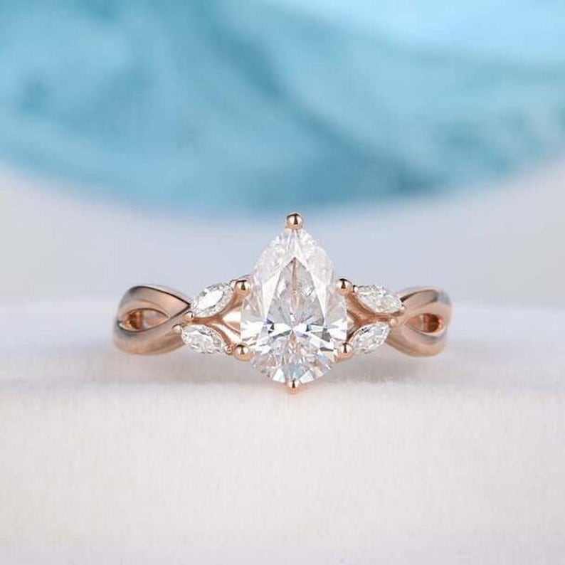 แหวนหมั้นเพชรโมอิสซาไนต์ทรงลูกแพร์สุดฮิต ทองคำขาว 14K ประดับหินห้าเม็ด แหวนแต่งงาน แหวนสัญญา ของขวัญวันครบรอบสำหรับภรรยา