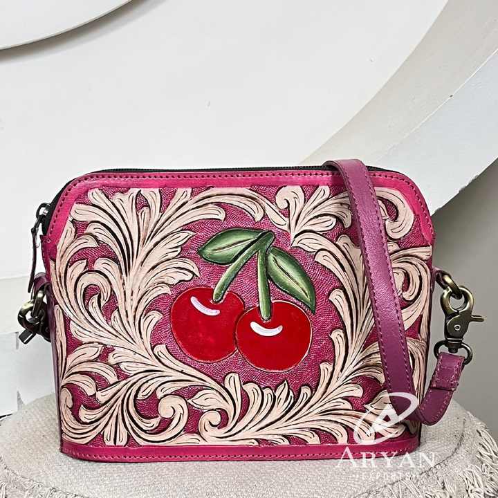 Hand Tooled Genuine Leather Cherry Crossbody Bag