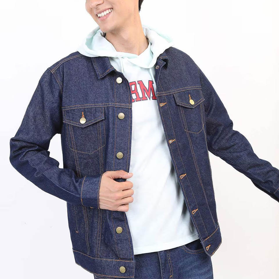 เสื้อแจ็กเก็ตยีนส์สำหรับผู้ชายสไตล์สตรีทพลัสไซส์ปกตั้งดีไซน์แบบเย็บปะติดดีไซน์แบบอุตสาหกรรมจำนวนมาก