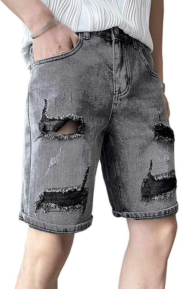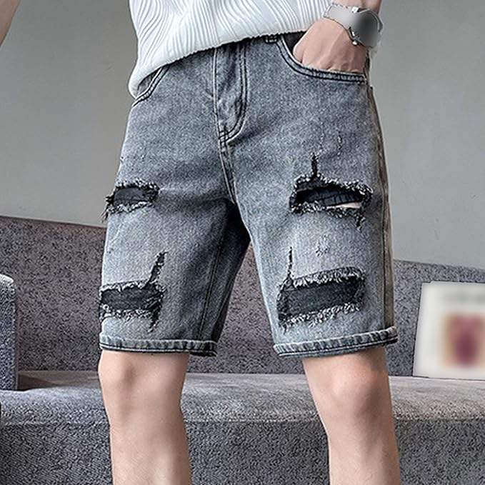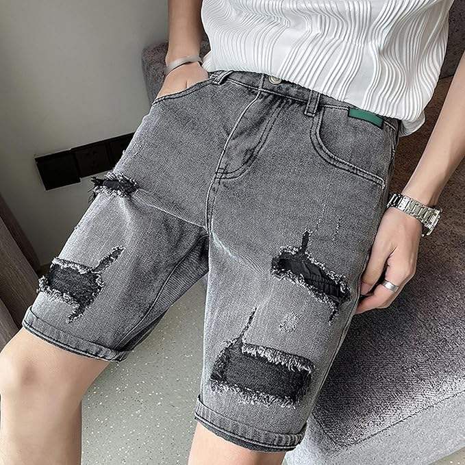 กางเกงยีนส์ขาสั้นทรงสลิมฟิตสำหรับผู้ชาย สไตล์ฮิปฮอป ระบายอากาศได้ดี เหมาะสำหรับฤดูร้อน ดีไซน์ขาดๆ แต่งขอบเอวแบบม้วน