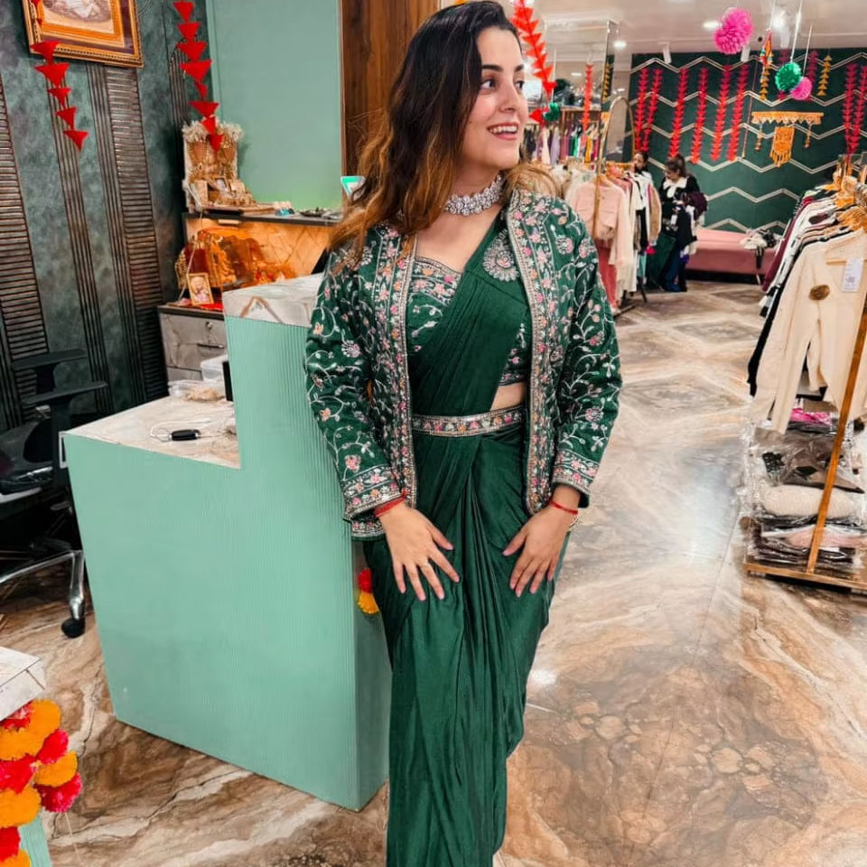 ชุดส่าหรีผ้าไหมชิโนนแบบใหม่ทันสมัยพร้อมงานปักเลื่อม พร้อมเสื้อคลุมและเสื้อปักสำเร็จรูป